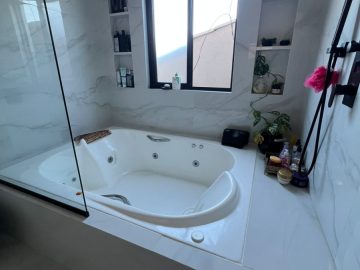 04 quartos, sendo 1 suíte master com closet e banheiro equipado com banheira de hidromassagem.