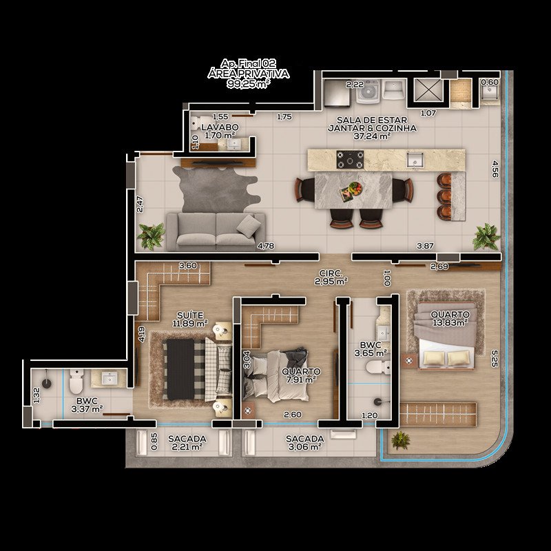 Com 99,25m² de área privativa, o imóvel oferece o equilíbrio perfeito entre conforto, estilo e uma localização simplesmente excepcional, e o melhor de tudo, esta localizado a apenas 250 metros da praia.