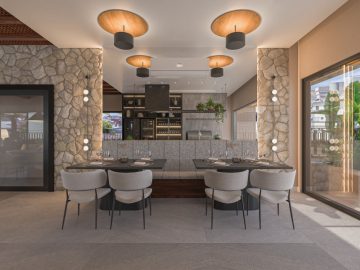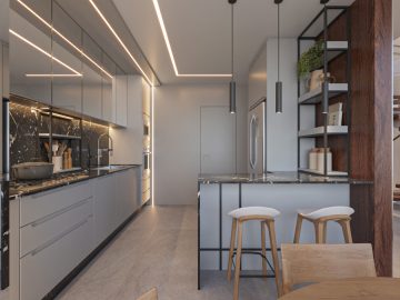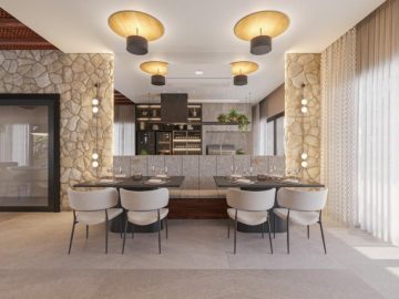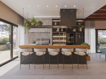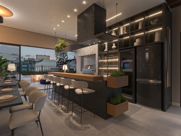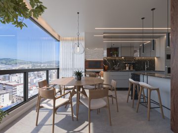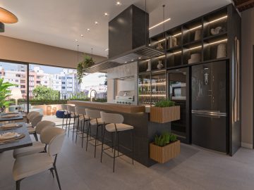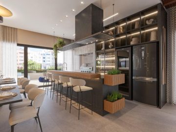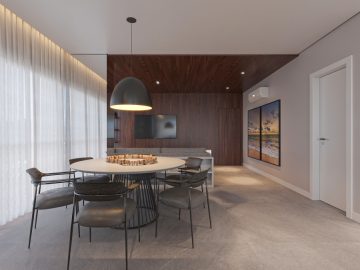 A sala de estar e jantar integradas formam um ambiente acolhedor e sofisticado, perfeito para receber com estilo. A cozinha americana une funcionalidade e design, criando uma atmosfera moderna e convidativa.