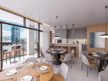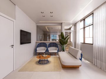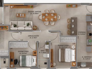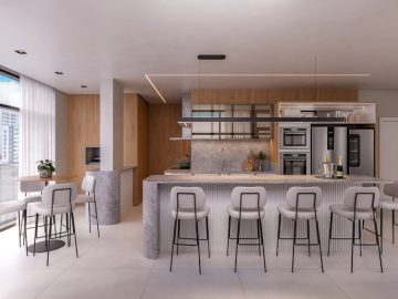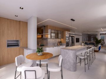 São 3 dormitórios, sendo 1 suíte, além de 1 banheiro social com acabamentos elegantes. A sala de estar e jantar integram-se harmoniosamente à cozinha, criando um ambiente fluido e acolhedor, perfeito para viver momentos de convívio e bem-estar