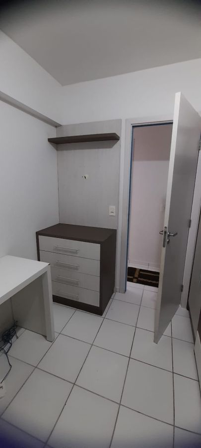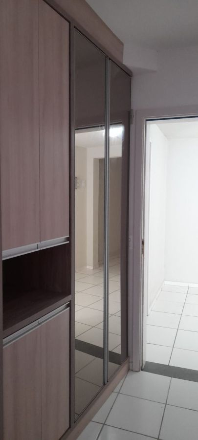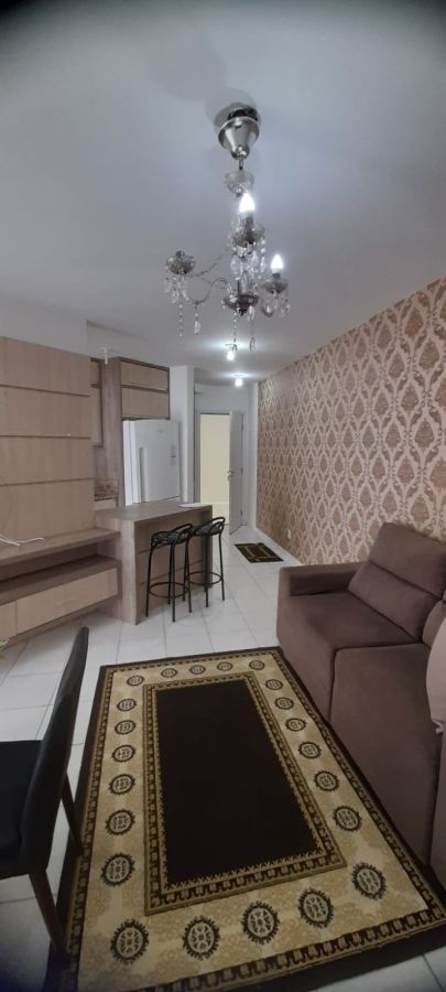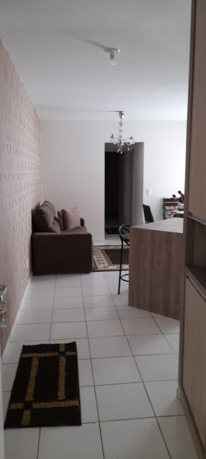 A unidade possui uma planta funcional composta por dois dormitórios e um banheiro social. A área social conta com uma sala de estar integrada a cozinha e sacada, proporcionando ventilação natural ao ambiente. O imóvel dispõe de uma vaga de garagem privativa.